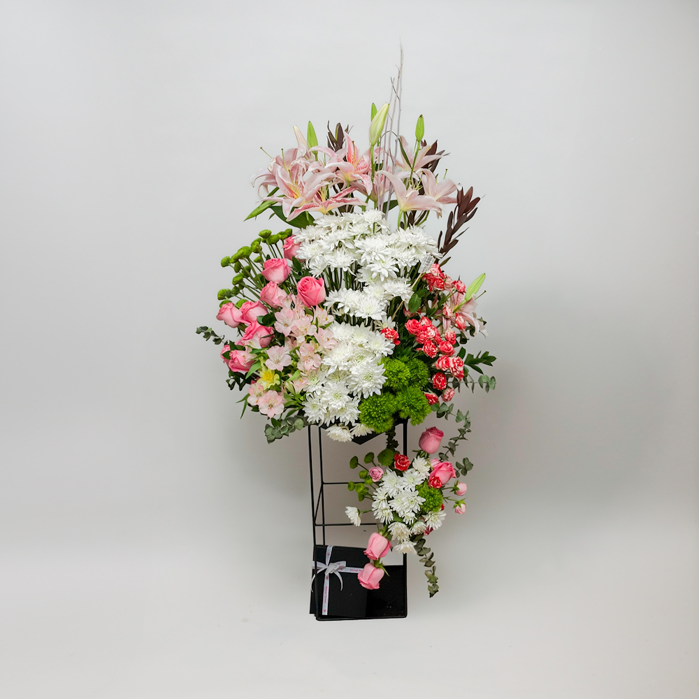 Bloom Harmony is an elegant standing floral arrangement that celebrates balance, grace, and natural beauty. A delicate blend of white lilies, soft pink roses, peach spray roses, and light chrysanthemums come together in perfect symmetry. The composition is designed to evoke calm sophistication and gentle charm.